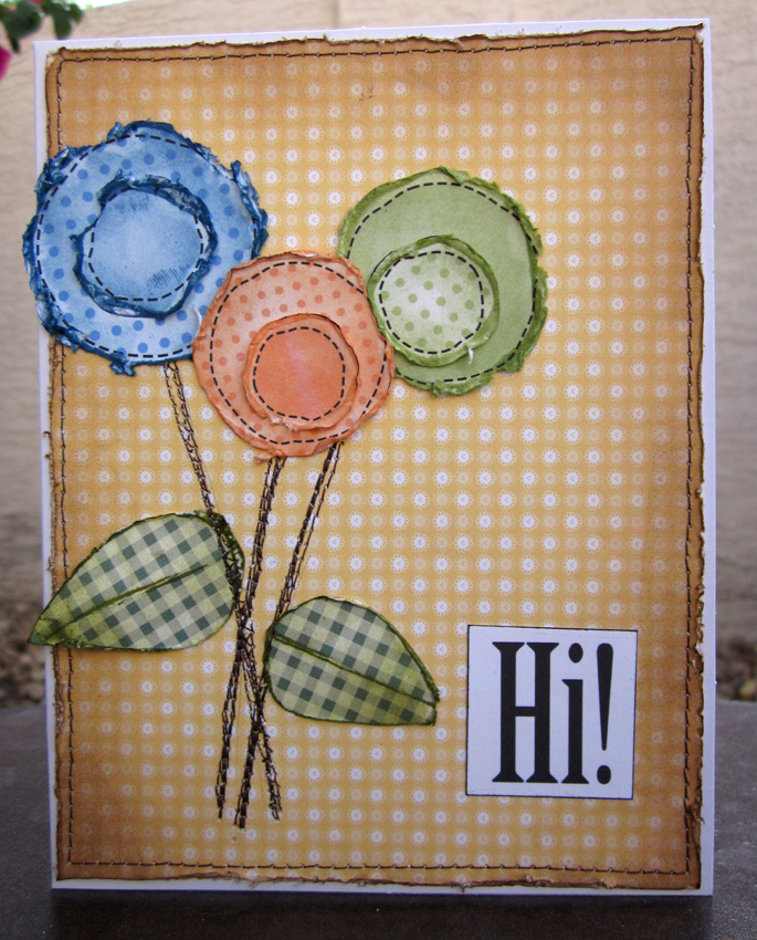 Norine: This was a fun challenge this week! I love distressing and I love the lollipop flowers on the Candy Doodles Collector Edition cd!! After cutting them out, I ran the edges around the Zutter Distrezz-It-All, and inked them up with coordinating Tim Holtz distress inks. The yellow background paper is from the Seasons of Sundae cd and the leaves are hand cut from checked paper printed from the Pretty Tuff cd. The flower stems and edges of the background paper are machine stitched and the greeting is printed and cut from the Pretty Tuff cd as well.