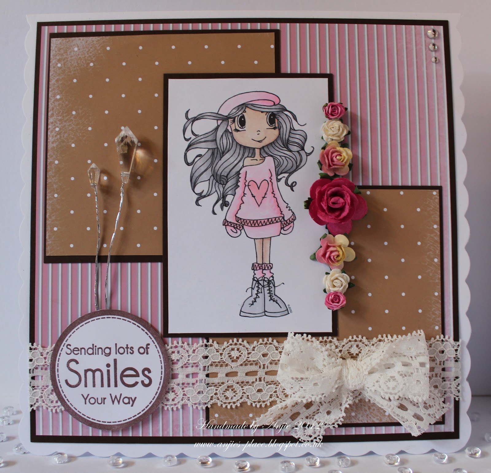 Anjie - The image I've used is from the new range of Time For Tea Designs that are available to buy here. I've coloured the image in with ProMarkers. The papers are from the Pretty Sweet CD and the sentiment from Sensational Sentiments Stamp Sheet. I've added some bling, flowers and lace from my stash.