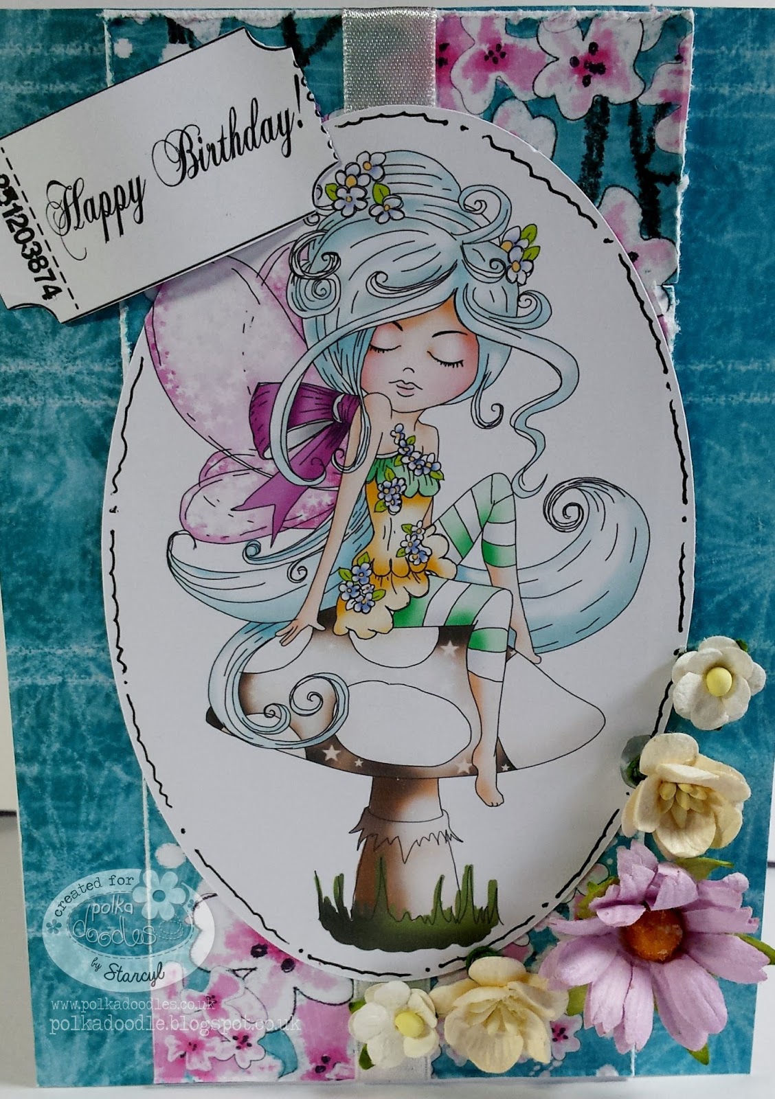 Naz - The image I have used here is a combination of three separate digis. The owl called HATS OFF TWIGGY is from Twiggy and Toots collection. BEAUTIFUL BIRDHOUSE 1 and the cat. I coloured the images with Copics and used foam adhesive to adhere it to the card. The Happy Birthday sentiments that I have used are also from Polkadoodles. To finish off the card I added some stitching for embellishment.