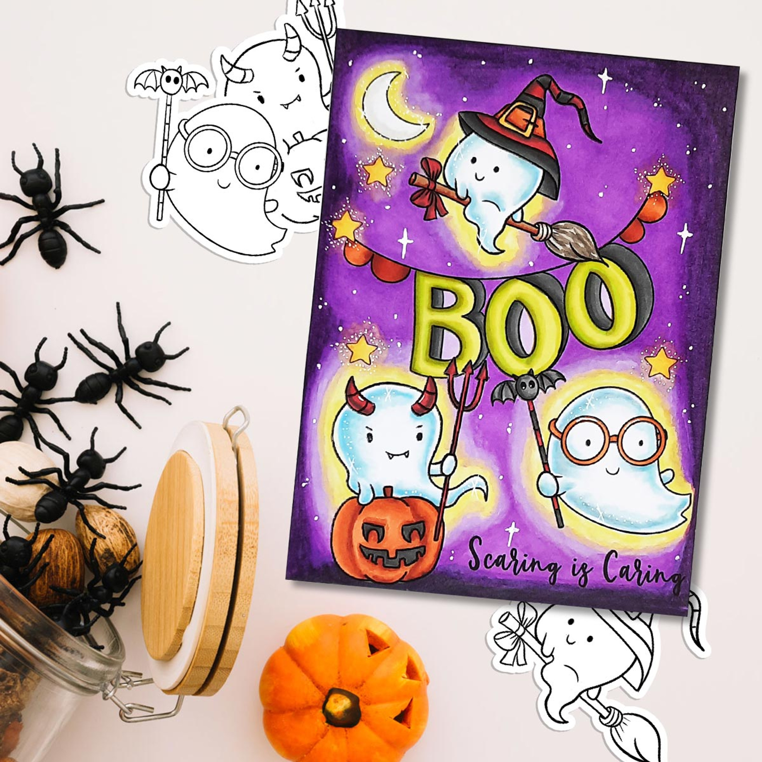 Judy - Halloween is coming, so my inspiration project for this week is a spooky Halloween card. I used the Cordelia Witch Halloween Digital Stamp, coloured with Prismacolor pencils and then carefully fussy cut for extra dimension. For the background, I added some stencilling on black glitter cardstock using the Starry Nights Stencil with white ink. The spooky looking tree was cut with a die from my stash, and I finished it off with some gems to decorate the branches. The sentiment is from the Boo Halloween Sentiment Bundle – such a fab set for quick and easy Halloween card makes!